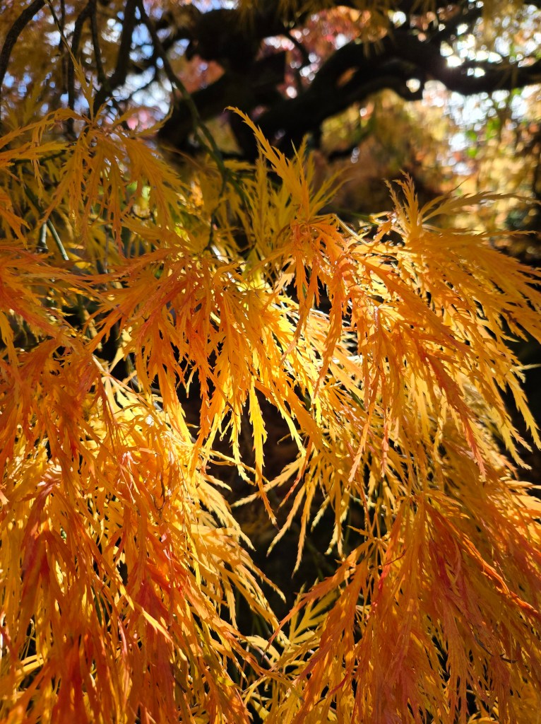 Japanese Maples grow large canopies despite their size and are seen as protective and calming in Japanese folklore. In their adolescent stage, the leaves haven’t formed their red colour yet and instead have a yellowish orange tint giving the tree a firey look.