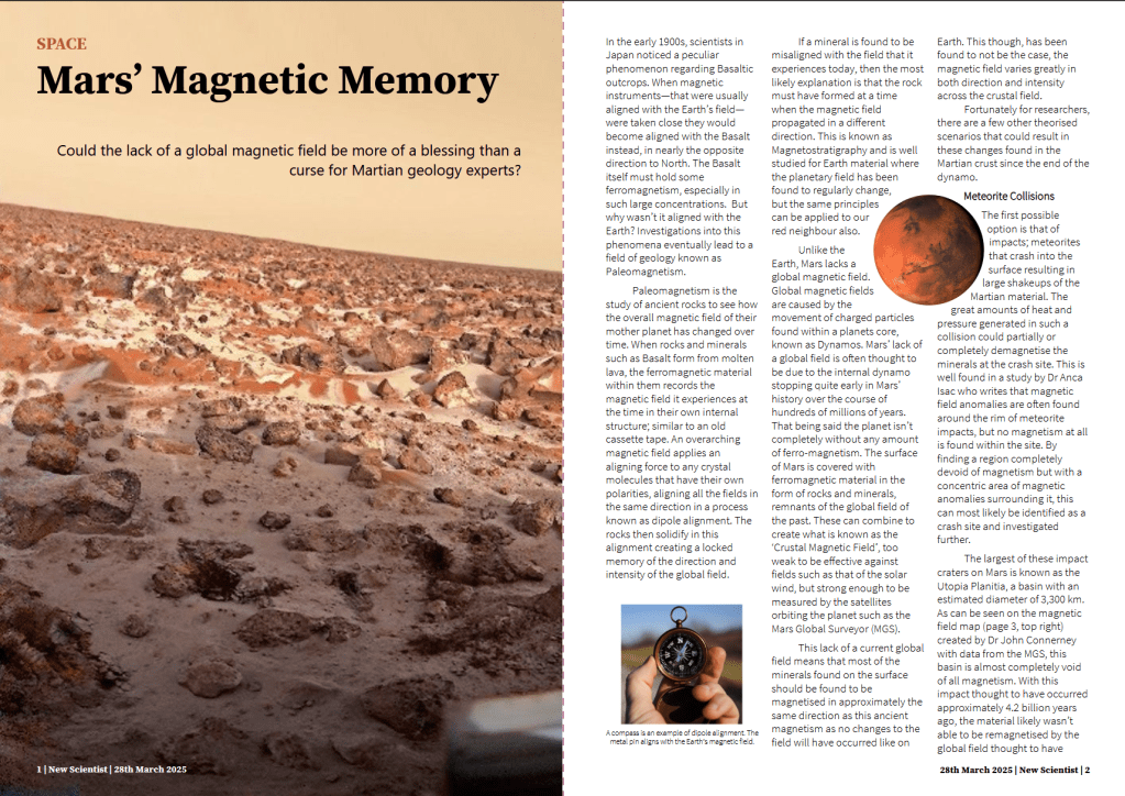 After a quick shower upon my return, I finished off an assignment. This assignment was actually really interesting and tasked us with writing an article in the style of the New Scientist magazine about a space-geology related topic. I wrote mine all about the ferromagnetism of the Martian crust (a topic I’m quite well versed in), I’ll put a little snippet of it below. Let me know what you think 🙂