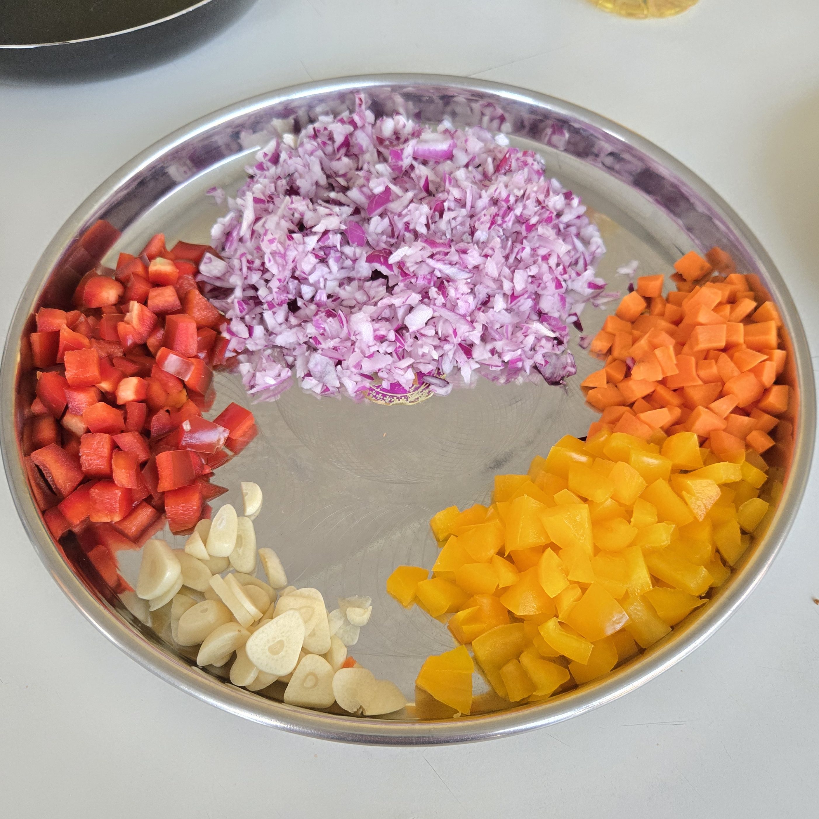 1. Slice the Garlic cloves into thin slices, Peppers and Onions into small chunks, and peel the Carrot before slicing into chunks also.