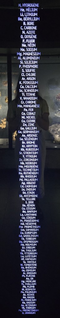 The exhibit was laid out in a long winding path, starting from the basics and building up to more modern day evolutions of our planet. One of the first things I came across was a long list describing all of the naturally occuring elements of the periodic table in order of their mass (from Hydrogen to Uranium). As I’m in France, all of the elements were listed with their French names which I found really fascinating! See if you can spot the differences in spelling and names in the list here: