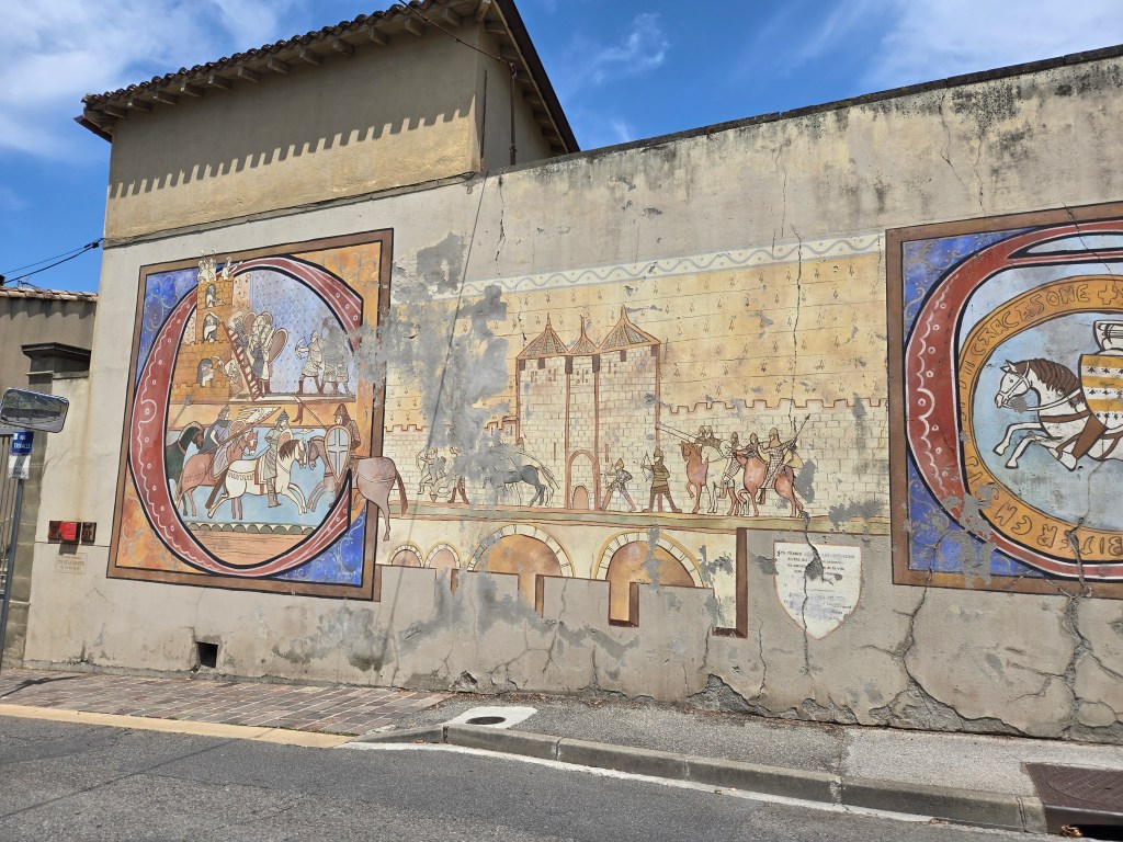 On the way out of the city, down towards the river, we passed a mural where medieval pictures filled the spaces between a giant writing of the city’s name: Carcassonne. The paintings were reminscent of old tapestries, depicting battles outside the gates, knights and kings. With the cracks in the walls and the fading of the paint only adding to the almost realism of the depiction of these kinds of tapestries.