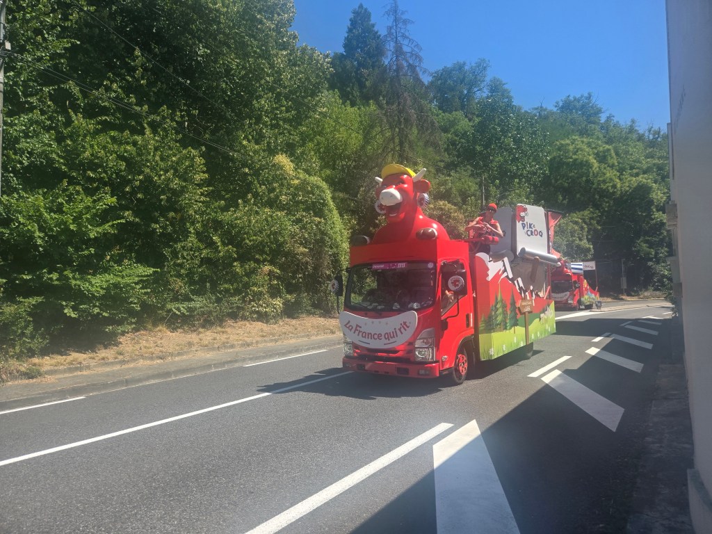 Something I actually had no idea about until the staff of this bar informed me just now, is that there is what’s known as ‘the caravan’ about to pass by us. This caravan is made up of loads of cars and trucks of the advertisers that are joined with the Tour de France. As they drive past, they throw small objects and samples to the people in the crowds. Advertisement for them, free stuff for me!